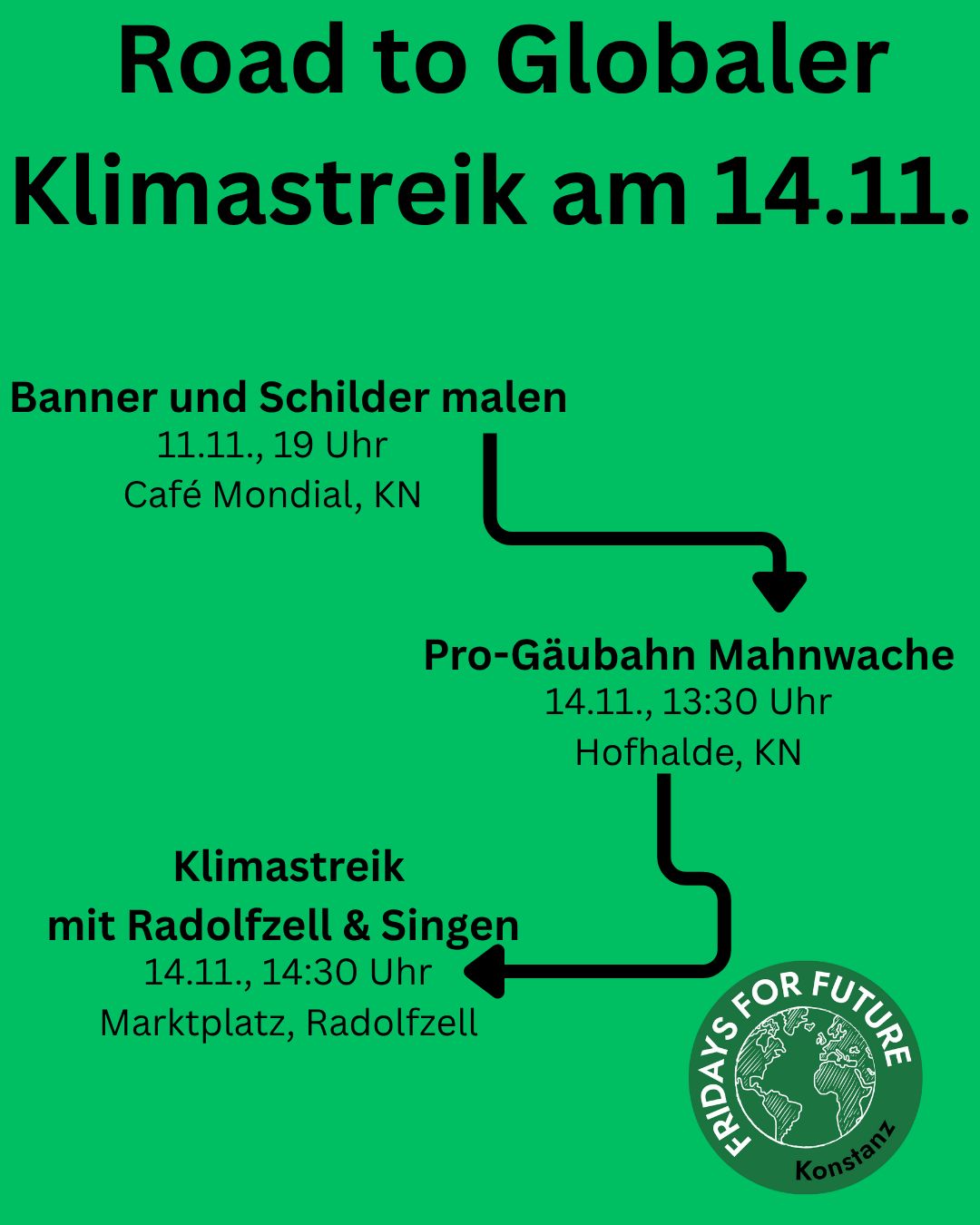 Der nächste Klimastreiktag findet am kommenden Freitag statt. Die örtlichen Gruppen von Fridays for Future laden zu einer Aktion auf dem Marktplatz in Radolfzell ein. Beginn: 14:30 Uhr. Eine Stunde vorher beginnt in Konstanz (in den „Freiräumen“ an der Hofhalde) eine Informationsveranstaltung zur geplanten Unterbrechung der Gäubahn, die ebenfalls klimatische Auswirkungen hat.