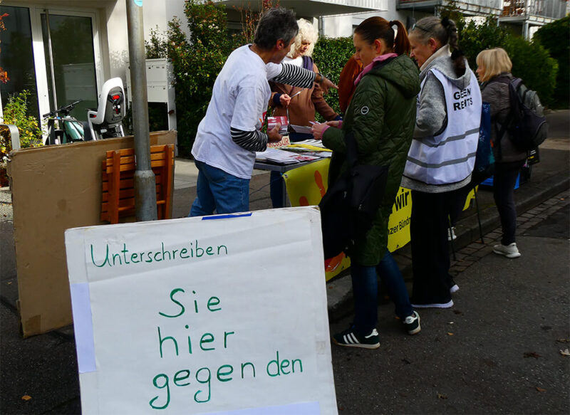 31. August 2024: Unterschriftensammlung für die Europäische Bürgerinitiative Tax The Rich und die Petition gegen die geplante Aufhebung der bisherigen Gentech-Regeln in der EU. Auf dem Wochenmarkt in Konstanz-Petershausen.